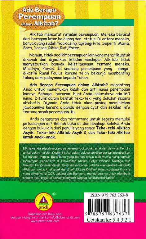 Alkitab mencatat ratusan perempuan. Mereka berasal dari beragam latar belakang dan status. Di antara mereka banyak yang sudah tidak asing lagi bagi kita. Seperti Maria, Sara, Dorkas, Ribka, Rut, Ester. Namun tidak sedikit perempuan lain yang menarik untuk dikenali dan dijadikan teladan meskipun Alkitab tidak menyebutkan banyak keistimewaan tentang mereka. Misalnya, Persis. Ia seorang perempuan yang dikasihi Rasul Palus karena telah bekerja membanting tulang demi pelayanan kepada Tuhan. Anda penasaran dan tertantang untuk segera memulai petualangan ini? Jangan ragu-ragu membaca buku ini!