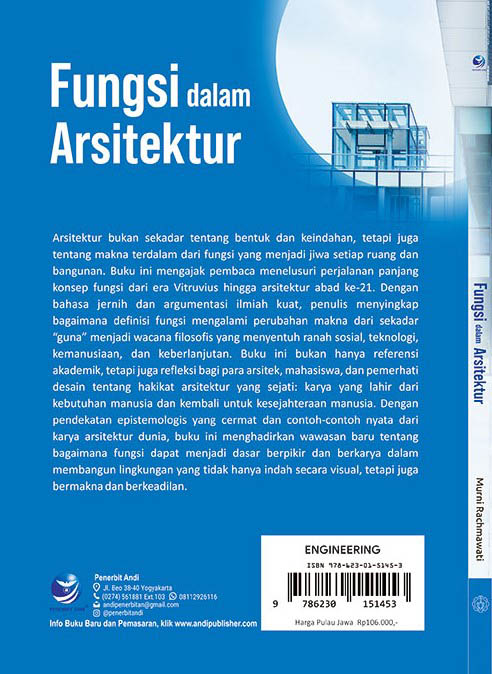 Buku ini adalah buku pertama dari Seri Buku Arsitektur yang terdiri dari buku dengan judul: Fungsi dalam Arsitektur; Estetika dalam Arsitektur; Makna dalam Arsitektur dan Keberlanjutan dalam Arsitektur. Seri Buku ini dapat dijadikan referensi untuk Mata Kuliah: Pengantar Arsitektur dan Teori Arsitektur , Telaah Fungsi dan Guna atau mata kuliah lain dalam konteks arsitektur yang dibutuhkan untuk mahasiswa Prodi Sarjana dan Prodi Magister Arsitektur.