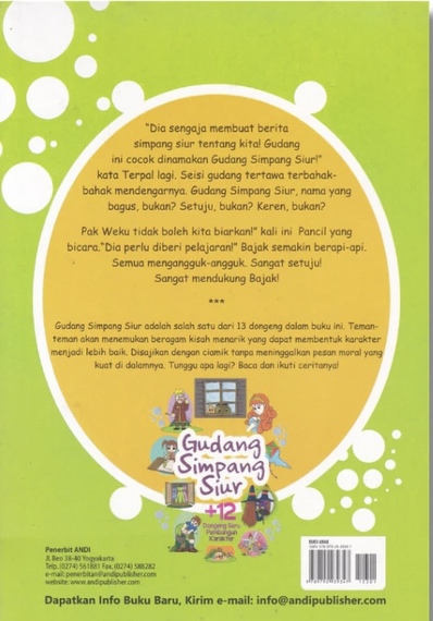 ISBN :978-979-29-3934-7 | Jml Hal :vi+102 | Ukuran : 13x19 | Edisi : i | Zona 1 :39000 | Zona 2 : 43000 | Zona 3 : 49000 | Gudang Simpang Siur + 12 Dongeng Seru Pembangun Karakter “Diasengajamembuatberitasimpangsiurtentangkita!GudanginicocokdinamakanGudangSimpangSiur!†kata Terpallagi.Seisigudangtertawaterbahak-bahakmendengarnya.GudangSimpangSiur, nama yang bagus, bukan? Setuju, bukan?Keren, bukan? Pak Wekutidakbolehkitabiarkan!†kali ini Pan-cil yang bicara.“Diaperludiberipelajaran!â€Bajaksemakinberapi-api. Semuamengangguk-angguk.Sangatsetuju! SangatmendukungBajak! Gudang Simpang Siur adalah salahsatudari 13dongengdalambukuini. Teman-teman akan menemukan beragam kisah menarik yang dapat membentuk karakter menjadi lebih baik. Disajikan dengan ciamik tanpa meninggalkan pesan moral yang kuat di dalamnya. Tunggu apa lagi? Baca dan ikuti ceritanya!