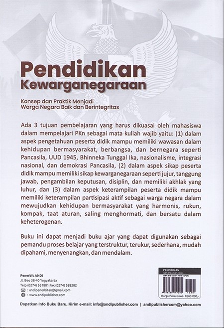 978-623-01-1920-0 ⁄ 2021 ⁄ 1st Published ⁄ I ⁄ 16x23 ⁄ viii+200 hlm Ada 3 tujuan pembelajaran yang harus dikuasai oleh mahasiswa dalam mempelajari PKn sebagai kuliah wajib yaitu: (1) dalam aspek pengetahuan peserta didik mampu memiliki wawasan dalam kehidupan bermasyarkat, berbangsa, dan bernegara seperti Pancasila, UUD 1945, Bhinneka Tunggal Ika, nasionalisme, integrasi nasional, dan demokrasi Pancasila, (2) dalam aspek sikap peserta didik mampu memiliki sikap kewarganegaraan seperti jujur, tanggung jawab, pengambilan keputusan, disiplin, dan memiliki akhlak yang luhur, dan (3) dalam aspek keterampilan peserta didik mampu memiliki keterampilan pastisipasi aktif sebagai warga negara dalam mewujudkan kehidupan bermasyarakat yang harmonis, rukun, kompak, taat aturan, saling menghormati, dan bersatu dalam keheterogenan. Buku ini dapat menjadi buku ajar yang dapat digunakan sebagai pemandu proses belajar yang terstruktur, terukur, sederhana, mudah dipahami, menyenangkan, dan mendalam.
